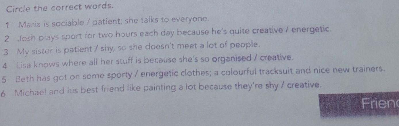 F 1 C Circle the correct words. 1 María is sociable / patient; she talks to everyone. 2 Josh plays sport for two hours each day because he's quite creative / energetic. 3 My sister is patient / shy, so she doesn't meet a lot of people. Lisa knows where all her stuff is because she's so organised / creative. 5 Beth has got on some sporty/ energetic clothes; a colourful tracksuit and nice new trainers. Michael and his best friend like painting a lot because they're shy / creative. 6 4 Friends & F