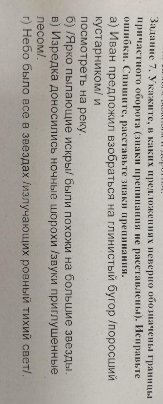 Задание 7. Укажите, в каких предложениях неверно обозначены границы причастного оборота (знаки препинания не расставлены). Исправьте ошибки. Спишите, расставьте знаки препинания. a) Иван предложил взобраться на глинистый бугор /поросший кустарником/ и посмотреть на реку. б) /Ярко пылающие искры/ были похожи на большие звезды. в) Изредка доносились ночные шорохи /звуки приглушенные лесом/. г) Небо было все в звездах /излучающих ровный тихий свет/.