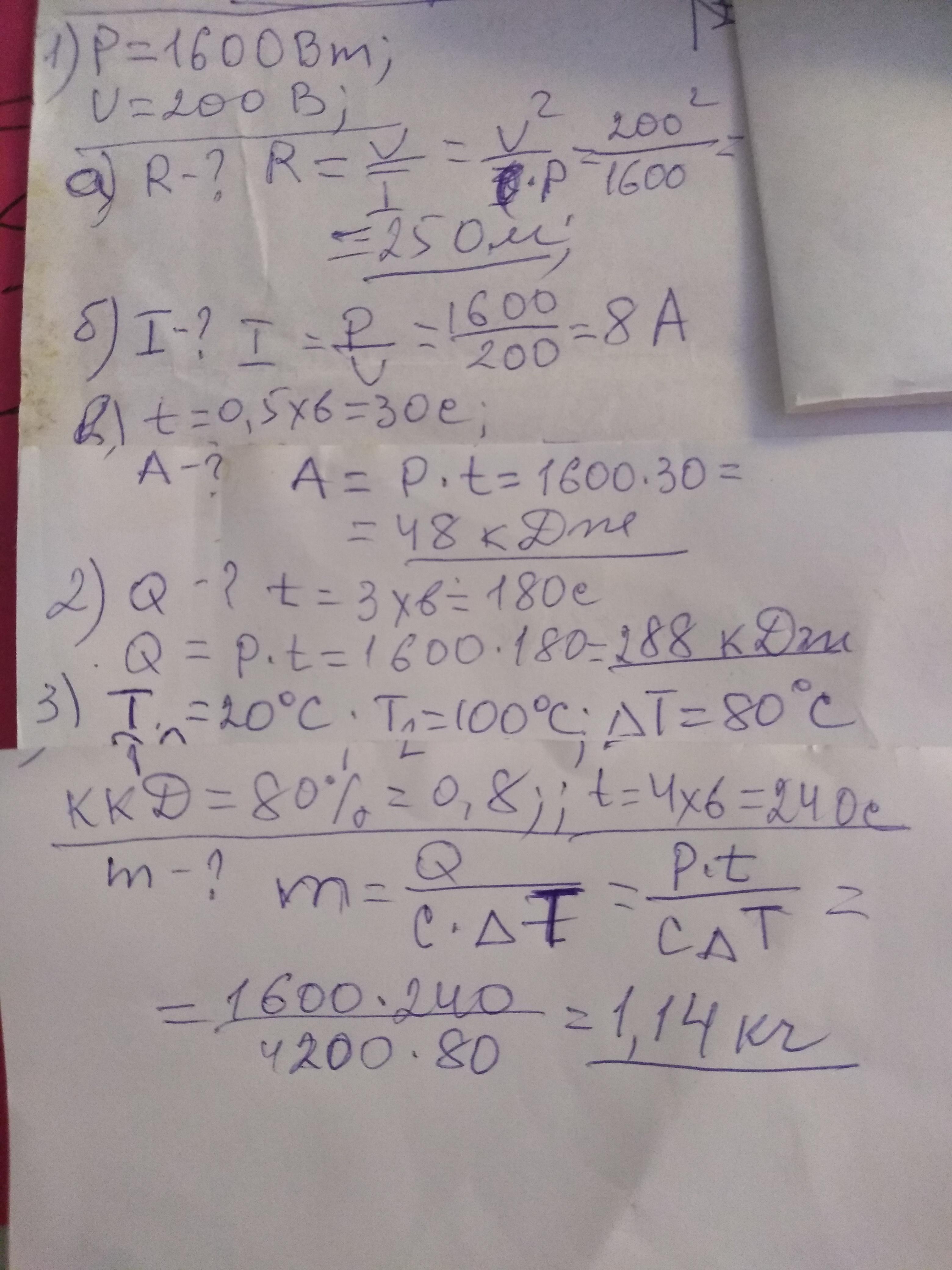 На електрочайнику вказано: 1600 Вт, 200 В. Визначити: а) опір нагрівального елемента? б) силу струму,що проходить через електрочайник? в) роботу струму за 0,5 хв.? 2) Яку кількість теплоти виділить нагрівальний елемент цього електрочайника за 3 хв? 3) Яку масу води можна довести до кипіння від 20 град. цим чайником за 4 хв, якщо його ККД=80%? (відповідь округлити до 0,01)
