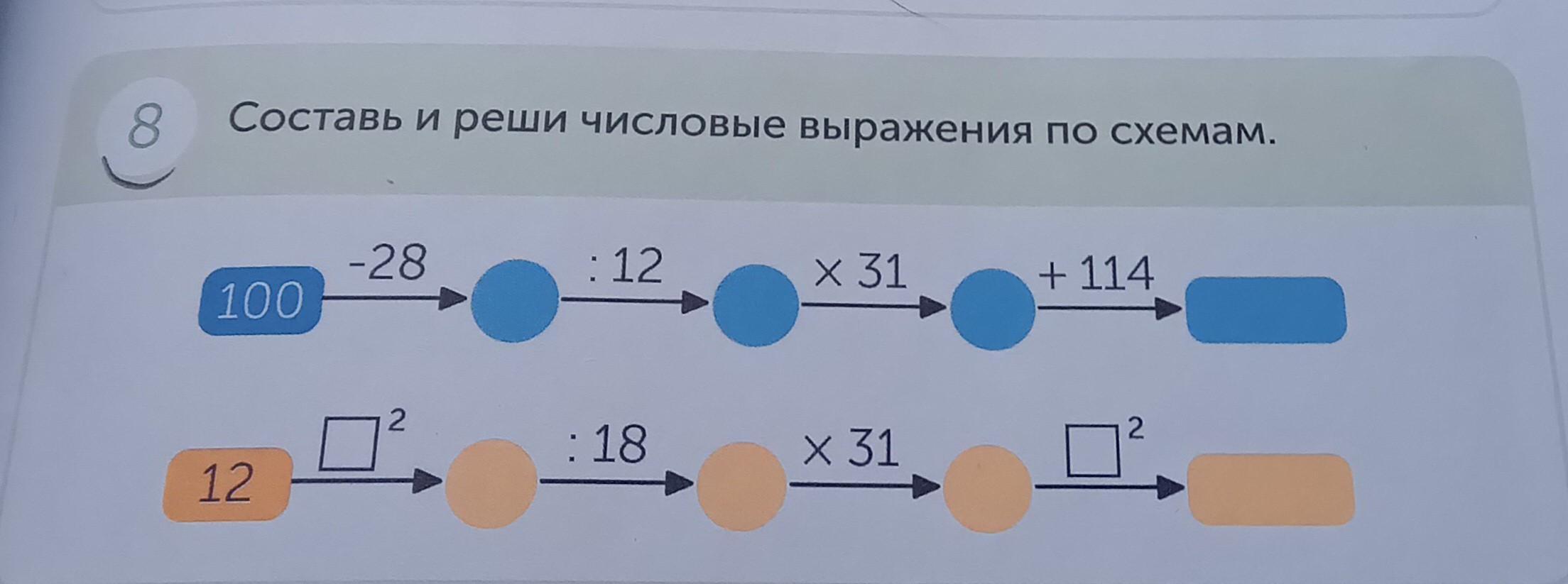 8 Составь и реши числовые выражения по схемам. 100 12 -28 : 12 : 18 X 31 X 31 + 114