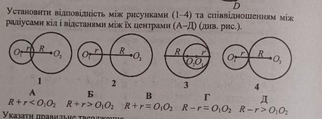 34. Установити відповiднiсть між рисунками (1-4) та співвідношенням між радіусами кiл i відстанями між ïх центрами (А-Д) (див. рис.). 0.0₂ 1 0 2 О 2 R.0₂ R 0₂0₁ 3 OR 4 Ог A Б В Г Д R+r 0,02 R+r=0,02 R-r=002 R-r> 0,02 Указати правильне твердження
