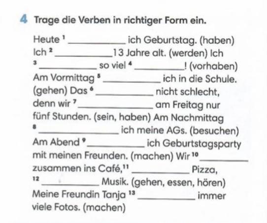 Heute habe ich Geburtstag. Ich werde 13 Jahre alt. Ich habe so viel vor! Am Vormittag gehe ich in die Schule. Das ist nicht schlecht, denn wir haben am Freitag nur fünf Stunden. Am Nachmittag besuche ich meine AGs. Am Abend mache ich Geburtstagsparty mit meinen Freunden. Wir gehen zusammen ins Cafe, essen Pizza, hören Musik. Meine Freundin Tanja macht immer viele Fotos.