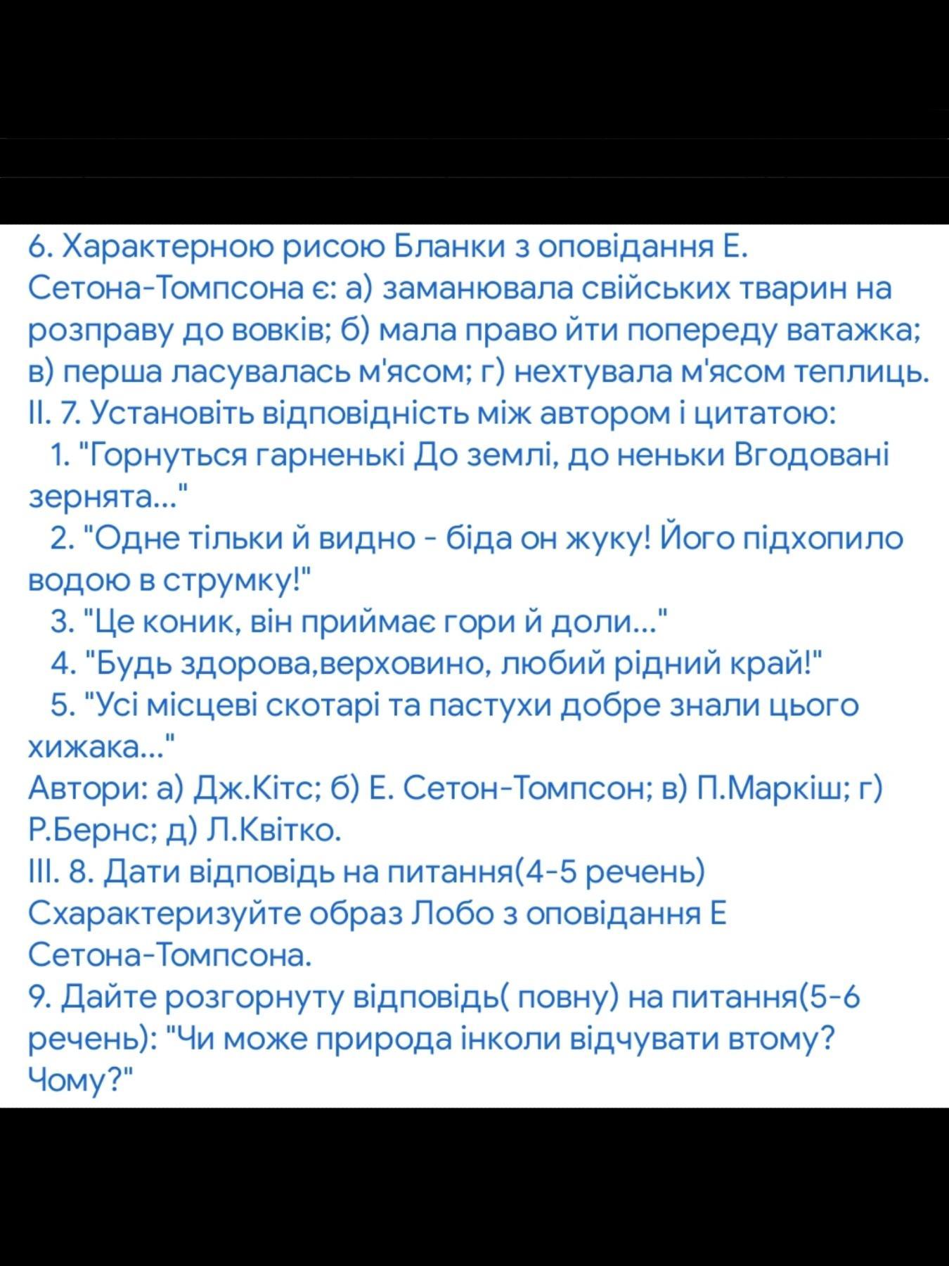 Ответ:Характерною рисою Бланки з оповідання Е. Сетона-Томпсона є відповідь (б) мала право йти попереду ватажка.
