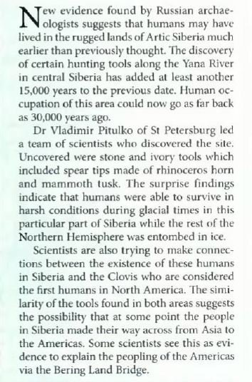 Новое доказательство найденное российскими археологами предполагает, что люди могли жить в суровых землях Арктической Сибири много раньше, чем думали первоначально. Открытие определенных охотничьих орудий вдоль реки Яна в центральной Сибири прибавляет по крайней мере ещё 15 тыс. лет к первоначальной дате. Человеческое поселение в этой площади могло отодвинуться до 30 тыс лет назад.