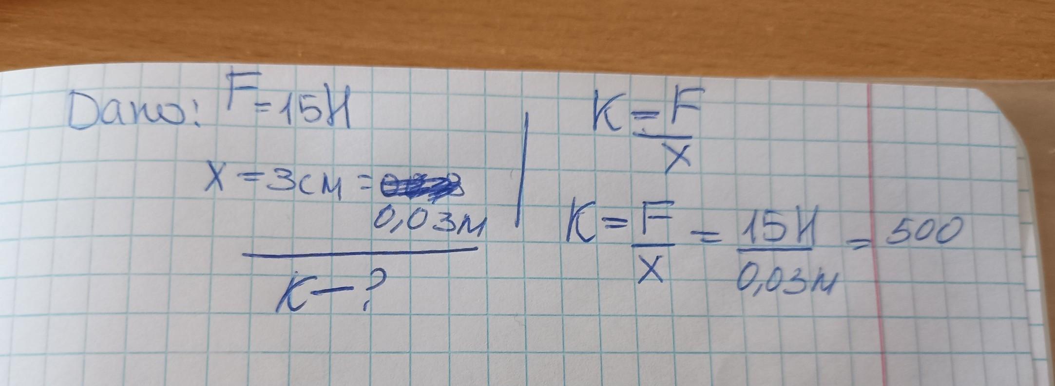 Розв'язати задачу Під дією сили 15Н пружина видовжилася на 3 см. Чому дорівнює жорсткість пружини? Потрібно повне розвязання.