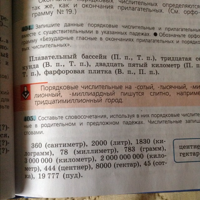 П.п. - в плавательном бассейне, Т.п. - плавательным бассейном. В.п. - тридцатую секунду, Т.п. тридцатой секундой. П.п. - на двадцать пятом километре, Т.п. двадцать пятым километром. В.п. фарфоровую плитку, П.п.- на фарфоровой плитке.