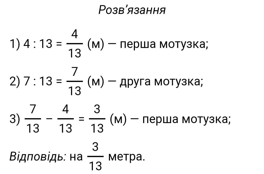 Допоможіть будь ласка: Довжина першої мотузки 4 м, а другої — 7 м. Кожну мотузку розрізали на 13 рівних частин. На скільки метрів кожна частина першої мотузки менша за