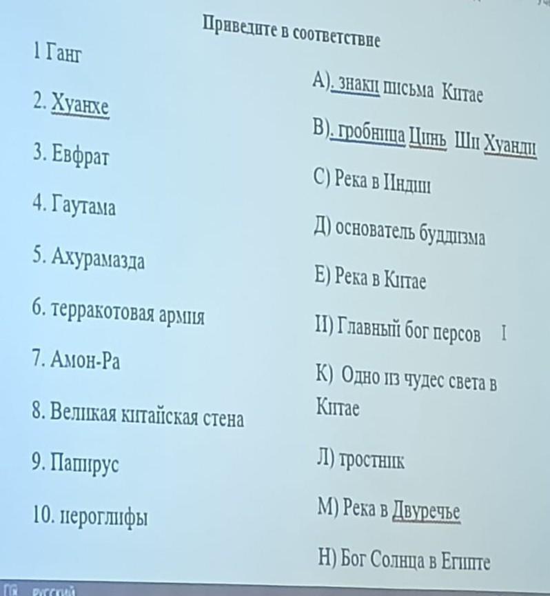 Приведите в соответствие 1 Ганг 2. Хуанхе 3. Евфрат 4. Гаутама 5. Ахурамазда 6. терракотовая армия 7. Амон-Ра 8. Великая китайская стена 9. Папирус 10. иероглифы А). Знаки письма Китае В). гробница Цинь Ши Хуан С) Река в Индии Д) основатель буддизма Е) Река в Китае 11) Главный бог персов К) Одно из чудес света в Китае Л) тростник М) Река в Двуречье Н) Бог Солнца в Египте