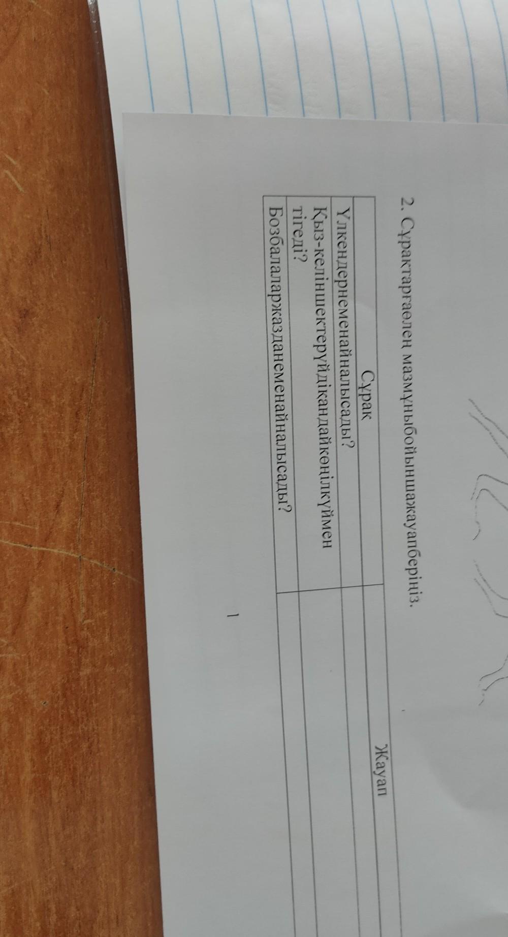 2. Сұрақтарғаөлең мазмұныбойыншажауапберіңіз. Сұрақ Үлкендернеменайналысады? Қыз-келіншектерүйдiкандайкөнілкүймен Бозбалаларжазданеменайналысады? тiгеді? 1 Жауап помогите срочно пж даю 100 баллов