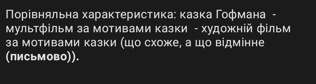 Отже, хоча казка Гофмана та мультфільм можуть мати спільність у сюжеті та персонажах, їх відмінності полягають у формі та способі подання. Казка Гофмана має важливість як класичний твір літератури, вона має свої особливості в мові та стилістиці, тоді як мультфільм є більше про візуальні ефекти та звуковий супровід.