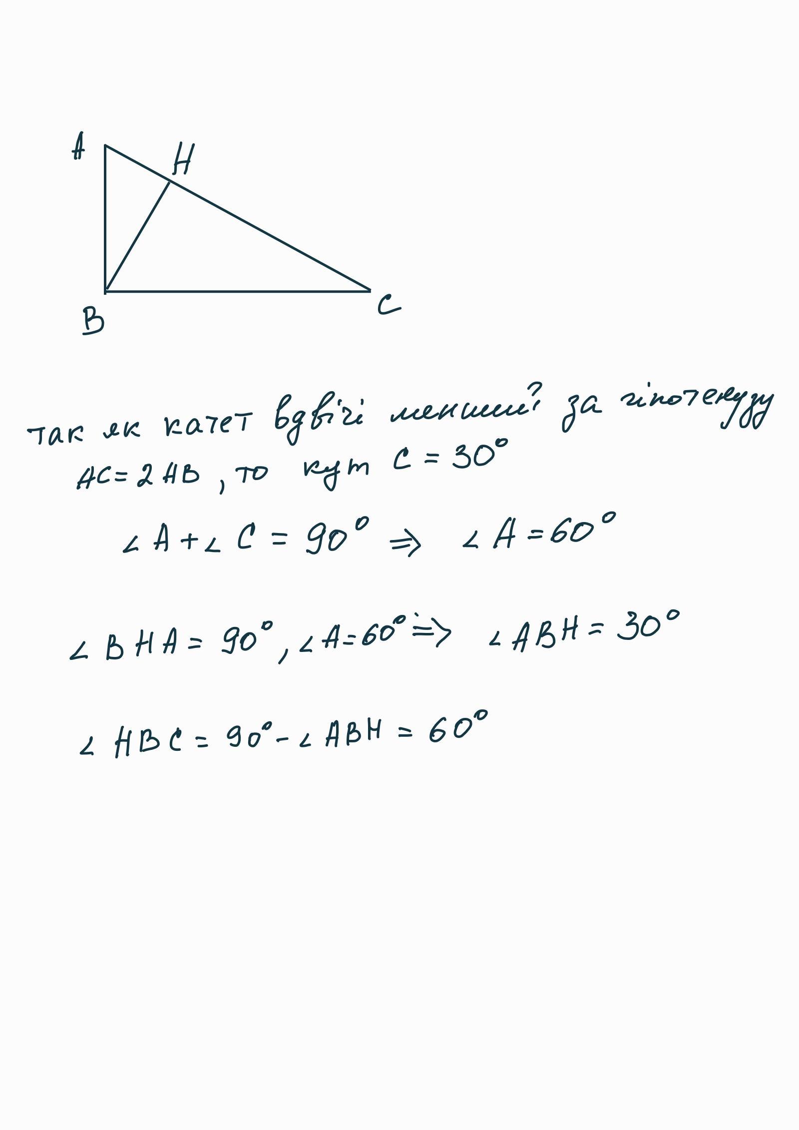 У прямокутному трикутни- ky ABC B=90°, AB = 8 CM, AC= 16 см. Знайдіть кути, які утворює висота ВН з катетами трикутника.