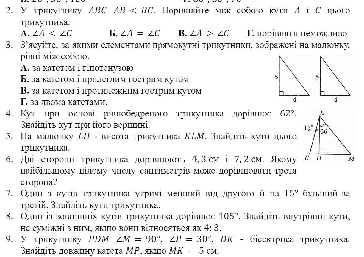 Ответ: 2.а 3.г 4. 56 будет 5. кут М=25 К=75 6. 11,4 7. 1 кут = 33 2кут = 99 3 кут = 48 8. 1кут = 60 2кут = 45 9. будет сторона 10 точно не знаю