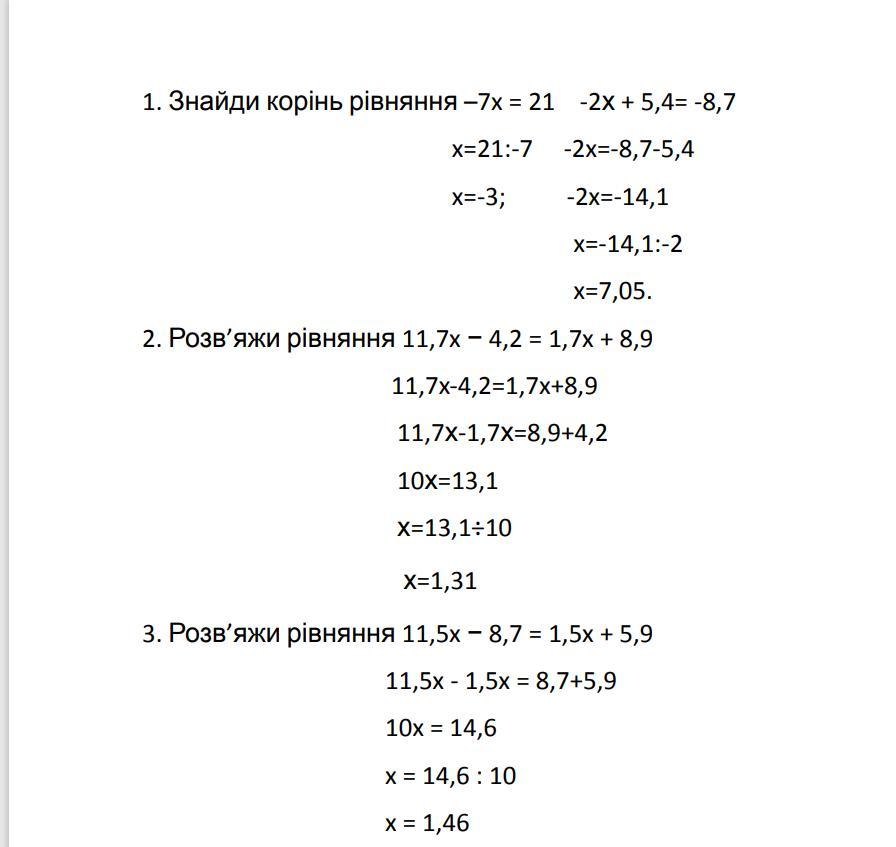 1. Знайди корінь рівняння –7x = 21; -2х + 5,4= -8,7