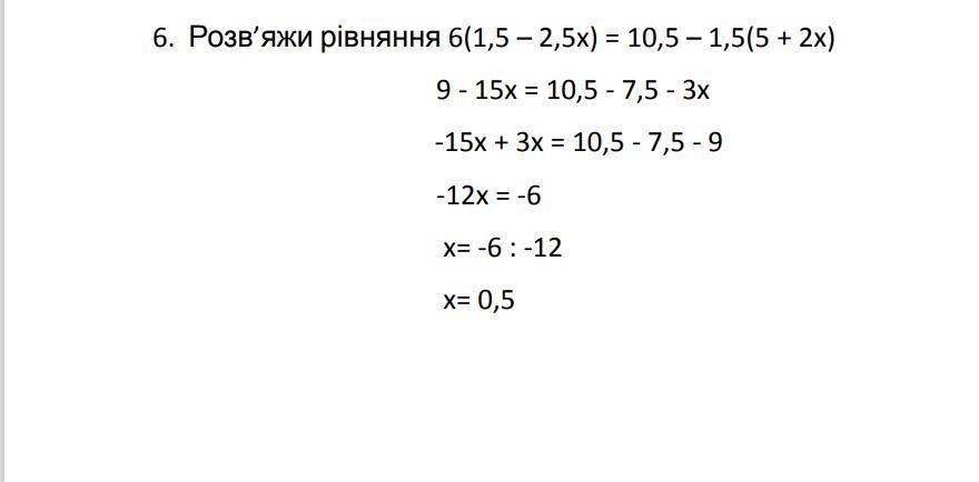 6. Розв’яжи рівняння 6(1,5 – 2,5x) = 10,5 – 1,5(5 + 2x)