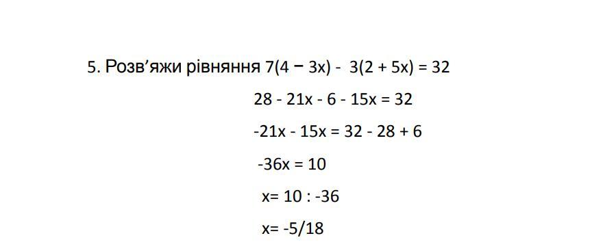 5. Розв’яжи рівняння 7(4 − 3x) - 3(2 + 5x) = 32.