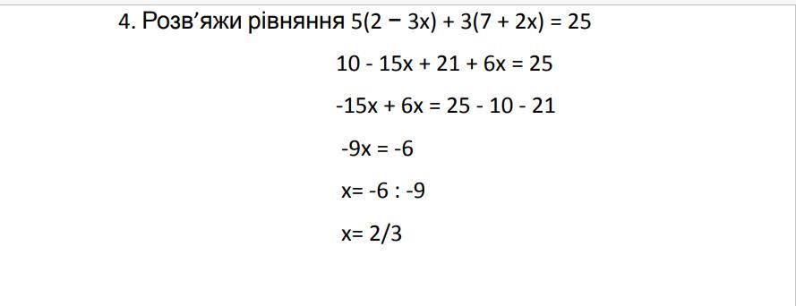 4. Розв’яжи рівняння 5(2 − 3x) + 3(7 + 2x) = 25.