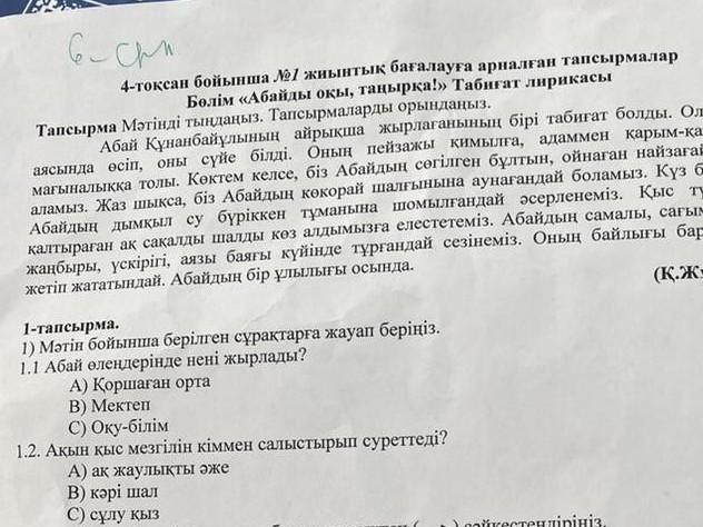 А) Коршаған орта В) Мектеп С) Оку-бiлiм 1.2. Акын кыс мезгiлiн кiммен салыстырып суреттеді? А) ак жаулықты әже В) кәрi шал С) сулу кыз сайкестендiрiнiз. Я дам 100балов