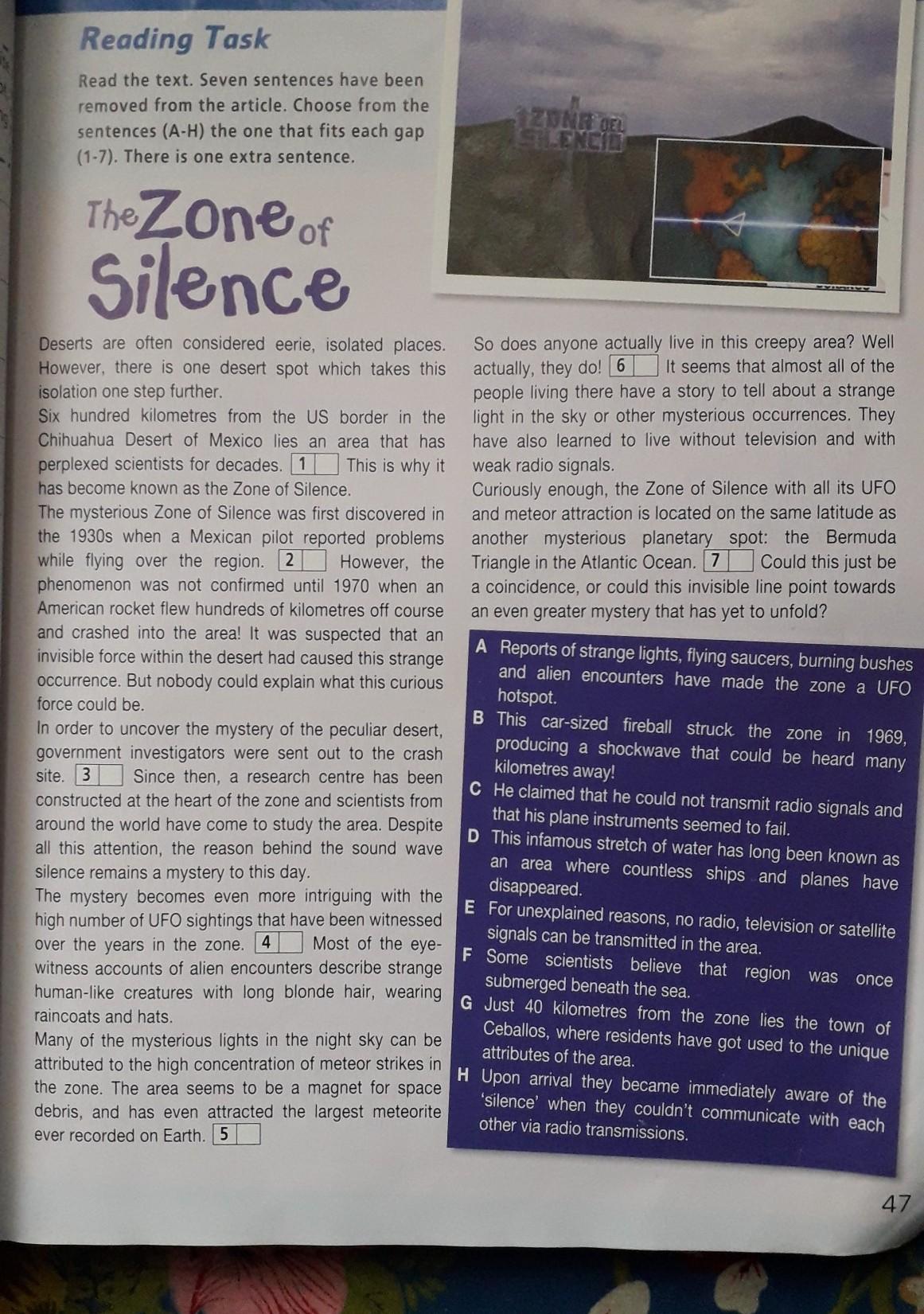 Read the text. Seven sentences have been removed from the article. Choose from the sentences (A-H) the one that fits each gap (1-7). There is one extra sentence. The Zone of Silence Deserts are often considered eerie, isolated places. However, there is one desert spot which takes this isolation one step further. Six hundred kilometres from the US border in the Chihuahua Desert of Mexico lies an area that has perplexed scientists for decades. 1 This is why it has become known as the Zone of Silence. The mysterious Zone of Silence was first discovered in the 1930s when a Mexican pilot reported problems while flying over the region. 2 However, the phenomenon was not confirmed until 1970 when an American rocket flew hundreds of kilometres off course and crashed into the area! It was suspected that an invisible force within the desert had caused this strange occurrence. But nobody could explain what this curious force could be. ZENIT the zone. The area seems to be a magnet for space debris, and has even attracted the largest meteorite ever recorded on Earth. 5 26 ENRO ZESKELKK So does anyone actually live in this creepy area? Well actually, they do! 6 It seems that almost all of the people living there have a story to tell about a strange light in the sky or other mysterious occurrences. They have also learned to live without television and with weak radio signals. Curiously enough, the Zone of Silence with all its UFO and meteor attraction is located on the same latitude as another mysterious planetary spot: the Bermuda Triangle in the Atlantic Ocean. 7 Could this just be a coincidence, or could this invisible line point towards an even greater mystery that has yet to unfold? A Reports of strange lights, flying saucers, burning bushes and alien encounters have made the zone a UFO hotspot. B This car-sized fireball struck the zone in 1969, producing a shockwave that could be heard many kilometres away! C He claimed that he could not transmit radio signals and that his plane instruments seemed to fail. D This infamous stretch of water has long been known as an area where countless ships and planes have disappeared. In order to uncover the mystery of the peculiar desert, government investigators were sent out to the crash site. 3 Since then, a research centre has been constructed at the heart of the zone and scientists from around the world have come to study the area. Despite all this attention, the reason behind the sound wave silence remains a mystery to this day. E For unexplained reasons, no radio, television or satellite signals can be transmitted in the area. The mystery becomes even more intriguing with the high number of UFO sightings that have been witnessed over the years in the zone. 4 Most of the eye- witness accounts of alien encounters describe strange F Some scientists believe that region was submerged beneath the sea. once human-like creatures with long blonde hair, wearing G Just 40 kilometres from the zone lies the town of Ceballos, where residents have got used to the unique raincoats and hats. attributes of the area. Many of the mysterious lights in the night sky can be attributed to the high concentration of meteor strikes in H Upon arrival they became immediately aware of the 'silence' when they couldn't communicate with each other via radio transmissions.