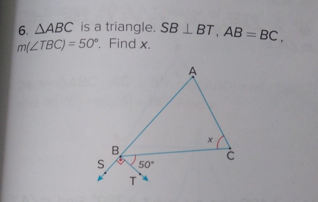 ABC is a triangle. SB | BT, AB = BC, m (<TBC) = 50°. Find x.