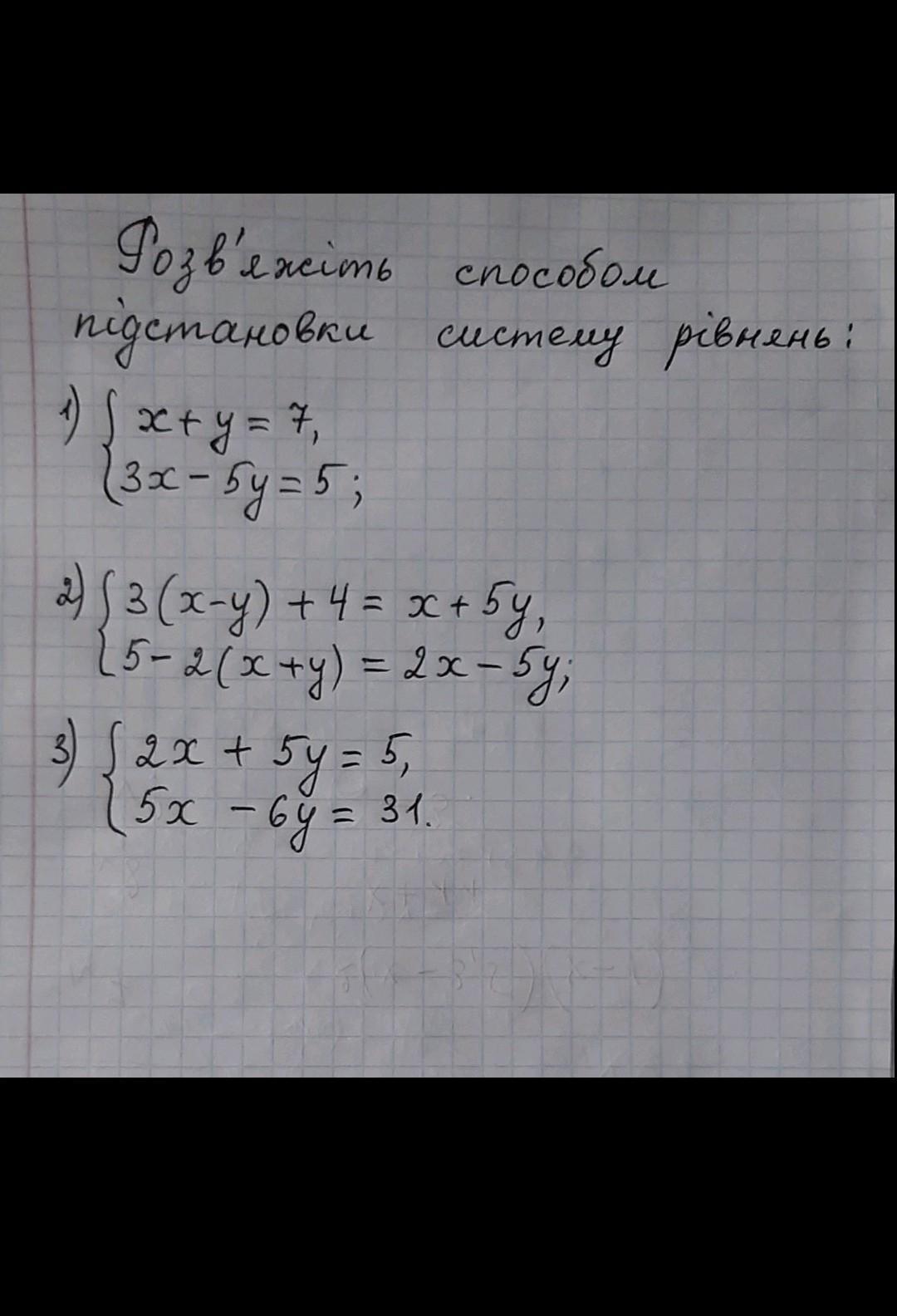Розв'яжіть способом nigстановки систему рівнянь: 4) ( x+y= 7, (3x-5y=5; 2 3(x-y) + 4 = x+5y, [5-2(x+y) = 2х-бу; 3) 2x + 5y= 5, 5 5 x - 6ў = 31. - ПОМОГИТЕ ПЖЖ МРОЧНО!