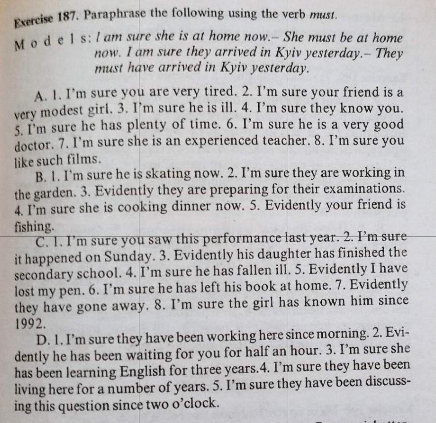 ТЕРМІНОВО!!!ДОПОМОЖІТЬ БУДЬ ЛАСКА, ДАЮ 40 БАЛІВ!!Exercise 187. Paraphrase the following using the verb must. Models: I am sure she is at home now. She must be at home now. I am sure they arrived in Kyiv yesterday. They must have arrived in Kyiv yesterday. - very A. 1. I'm sure you are very tired. 2. I'm sure your friend is a modest girl. 3. I'm sure he is ill. 4. I'm sure they know you. 5. I'm sure he has plenty of time. 6. I'm sure he is a very good doctor. 7. I'm sure she is an experienced teacher. 8. I'm sure you like such films. B. 1. I'm sure he is skating now. 2. I'm sure they are working in the garden. 3. Evidently they are preparing for their examinations. 4. I'm sure she is cooking dinner now. 5. Evidently your friend is fishing. C. 1. I'm sure you saw this performance last year. 2. I'm sure it happened on Sunday. 3. Evidently his daughter has finished the secondary school. 4. I'm sure he has fallen ill. 5. Evidently I have lost my pen. 6. I'm sure he has left his book at home. 7. Evidently they have gone away. 8. I'm sure the girl has known him since 1992. D. 1. I'm sure they have been working here since morning. 2. Evi- dently he has been waiting for you for half an hour. 3. I'm sure she has been learning English for three years. 4. I'm sure they have been living here for a number of years. 5. I'm sure they have been discuss- ing this question since two o'clock.