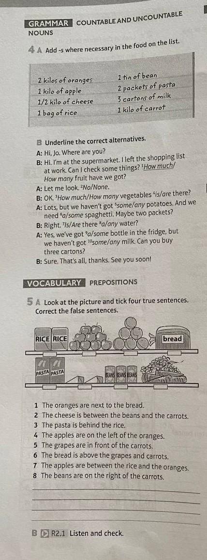 GRAMMAR COUNTABLE AND UNCOUNTABLE NOUNS 4 A Add -s where necessary in the food on the list. 2 kilos of oranges 1 kilo of apple 1/2 kilo of cheese 1 bag of rice B Underline the correct alternatives. A: Hi, Jo. Where are you? B: Hi. I'm at the supermarket. I left the shopping list at work. Can I check some things? 'How much/ How many fruit have we got? A: Let me look. ²No/None. 1 tin of bean 2 packets of pasta 3 cartons of milk 1 kilo of carrot B: OK. 'How much/How many vegetables "is/are there? A: Lots, but we haven't got 'some/any potatoes. And we need a/some spaghetti. Maybe two packets? B: Right. "Is/Are there a/any water? A: Yes, we've got 'a/some bottle in the fridge, but we haven't got ¹0some/any milk. Can you buy three cartons? B: Sure. That's all, thanks. See you soon! VOCABULARY PREPOSITIONS 5 A Look at the picture and tick four true sentences. Correct the false sentences. RICE RICE PASTA PASTA BEANS BEANS BEANS bread 1 The oranges are next to the bread. 2 The cheese is between the beans and the carrots. 3 The pasta is behind the rice. 4 The apples are on the left of the oranges. 5 The grapes are in front of the carrots. 6 The bread is above the grapes and carrots. 7. The apples are between the rice and the oranges. 8 The beans are on the right of the carrots. BR2.1 Listen and check..