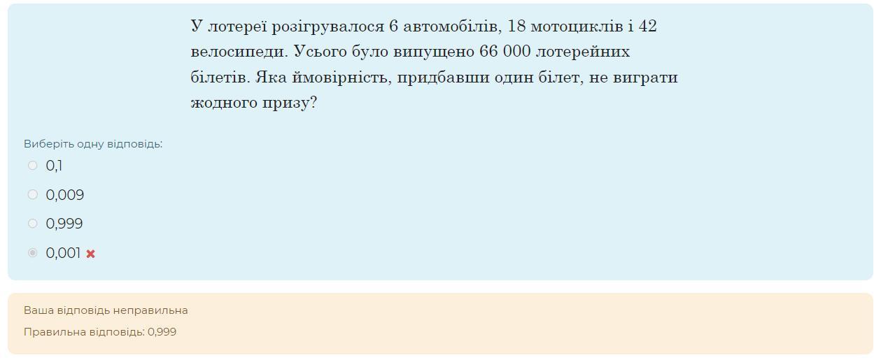 У лотереї розігрувалося 6 автомобілів, 18 мотоциклів і 42 велосипеди. Усього було випущено 66 000 лотерейних білетів. Яка ймовірність, придбавши один білет, не виграти жодного призу?