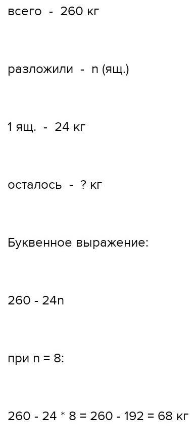 Я могу составить буквенное выражение по задаче. Запиши буквенное выражение по задаче. Фермеры собрали 260 кг помидоров. В л ящиков сложили по 24 кг. Сколько килограммов помидоров осталось? Вычисли при n = 8