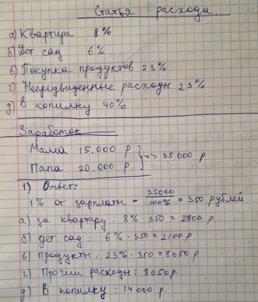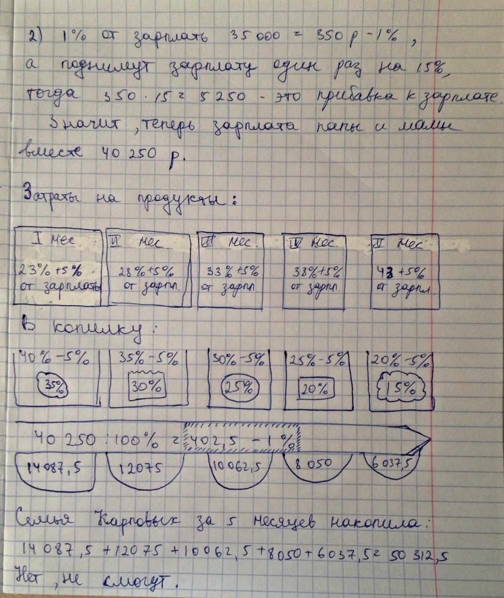 Задания: 1. Рассчитайте, какая сумма в рублях идет на каждую статью расхода, если Юрина мама зарабатывает 15 000 рублей, а Юрин папа 20 000 рублей в месяц. 2. Смогут ли Карповы съездить через 5 месяцев по путевке на юг, потратив на это деньги из копилки, если зарплату папе и маме поднимут единовременно на 15%, а цены на продукты ежемесячно будут расти в среднем на 5%? Цена путевки на трех человек, включая дорогу) - 60 000 рублей.