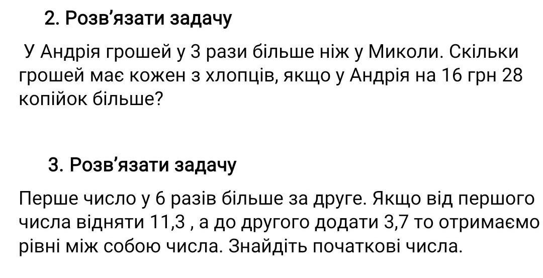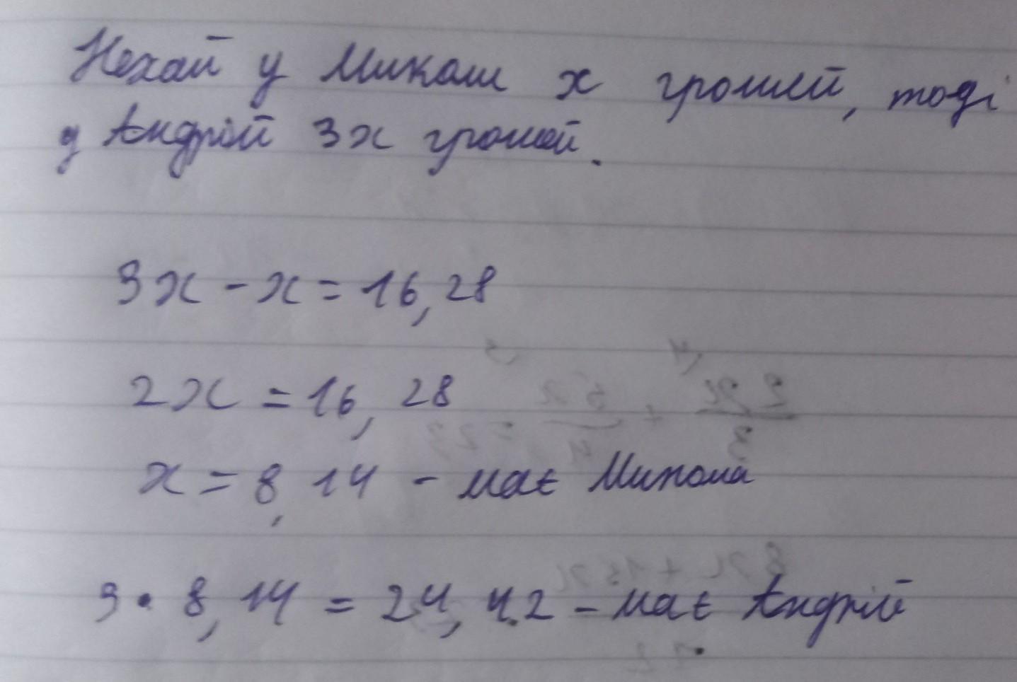 У Андрія грошей у 3 рази більше ніж у Миколи. Скільки грошей має кожен з хлопців, якщо у Андрія на 16 грн 28 копійок більше?