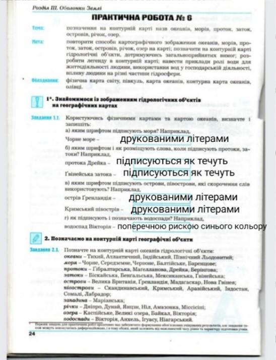 б) яким шрифтом і як розміщують слова, коли підписують протоки, за- токи? Наприклад, протока Дрейка - Ґвінейська затока -
