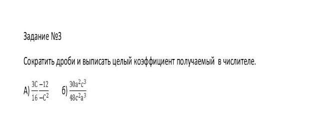 Задание №3 Сократить дроби и выписать целый коэффициент получаемый в числителе.решите и какое целое число в числителе