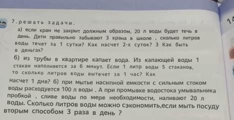 7.решать задачи. а) если кран не закрыт должным образом, 20 л воды будет течь в день. Дети правильно забывают 3 крана в школе , сколько литров воды течет за 1 сутки? Как насчет 2-х суток? 3 Как быть в деньгах? б) из трубы в квартире капает вода. Из капающей воды 1 стакан наполняется за 6 минут. Если 1 литр воды 5 стаканов. то сколько литров воды вытечет за 1 час? Как насчет 1 дня? б) при мытье насыпной емкости с сильным стоком воды расходуется 100 л воды. А при промывке водостока умывальника пробкой, сливе воды по мере необходимости, наливают 20 л воды. Сколько литров воды можно сэкономить,если мыть посуду вторым способом 3 раза в день ? СРОЧНО БРАТИШКЕ НУЖНЛ А Я НЕ ДОМА