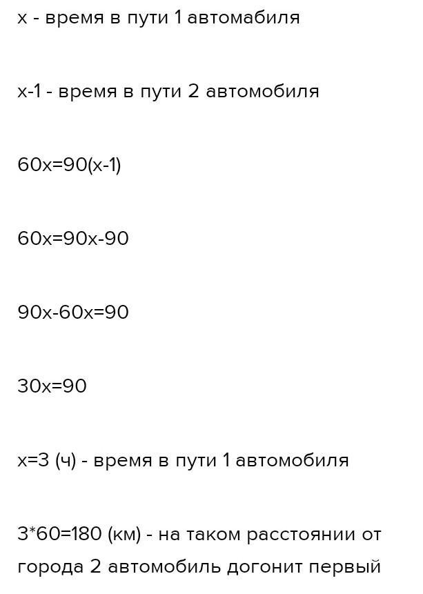 1325) Из города в населенный пункт выехал первый а стью 60 км/ч. Час спустя вслед за ним выеха со скоростью 90 км/ч. На одной и той же коо постройте графики движения автомобиля и л тетради две клетки принять за 30 км.) По гра ком расстоянии от го