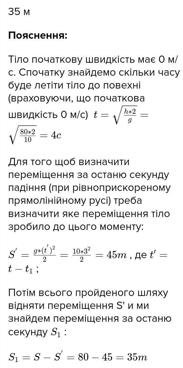Тіло падає з висоти 80м без початкової Швидкості. Визначити час падіння та кінцеву швидкість тіла.