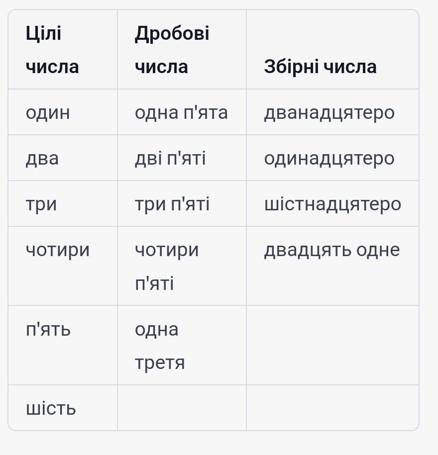 Числівники що означають цілі числа дробові та збірні записать у три колонки. НАПИШІТЬ ПОЖАЛУСТА У 3 КОЛОНКИ!!!! ДАЮ 60 б!!!