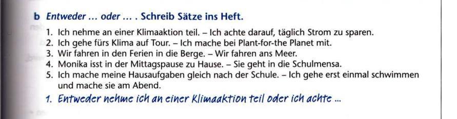 2. Entweder ich gehe fürs Klima auf Tour oder ich mache bei Plant-for-the-Planet mit.Entweder wir fahren in den Ferien in die Berge oder wir fahren ans Meer.Entweder Monika isst in der Mittagspause zu Hause oder sie geht in die Schulmensa.Entweder ich mache meine Hausaufgaben gleich nach der Schule oder ich gehe erst einmal schwimmen und mache sie am Abend.