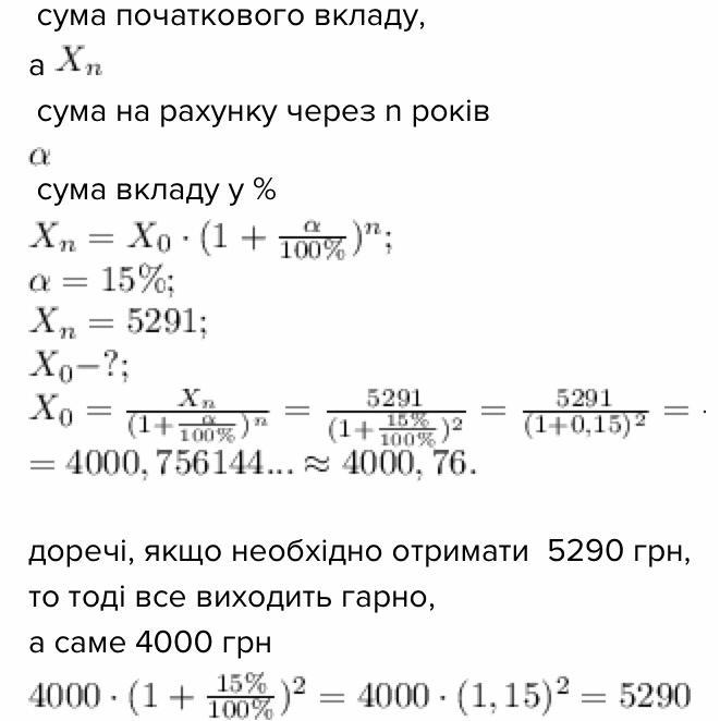 3. Яку суму грошей потрібно покласти в банк під 15% річних, щоб через 2 роки вона становила 5291 грн (прості відсотки)?