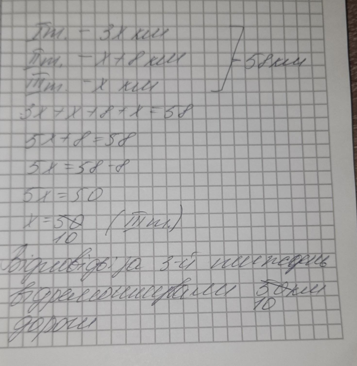 відремонтували в 3 рази більше, ніж за третій, а за другий на 8 км більше, ніж за третій. Скільки кілометрів дороги відремонтували за третій тиждень?