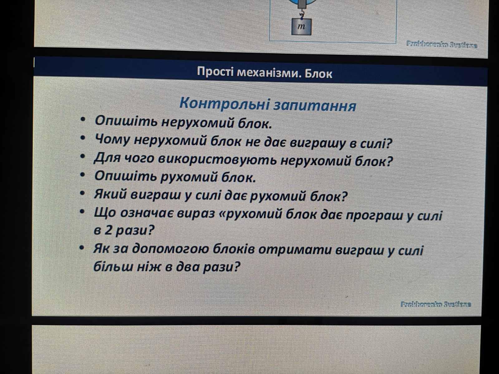 Ответ:1 Нерухомий блок - це блок, вісь якого нерухома. Нехай за допомогою блока ми піднімаємо вантаж масою m. Яку ж силу F для цього потрібно прикласти? Застосуємо до блока правило моментів як достатню умову рівноваги.