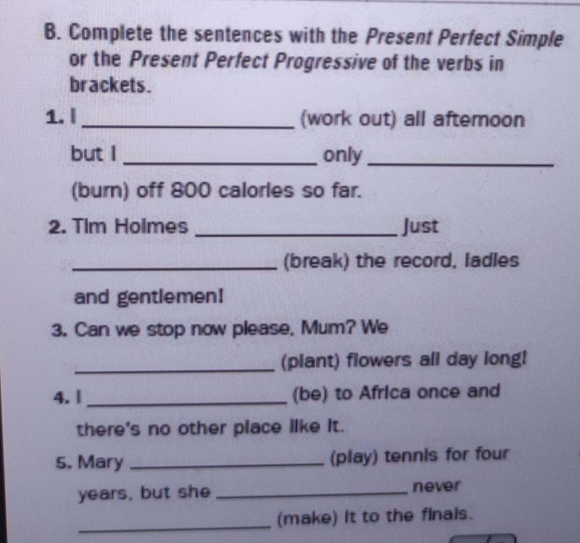 5) Mary has been playing tennis for four years,but she has never made it to the finals.