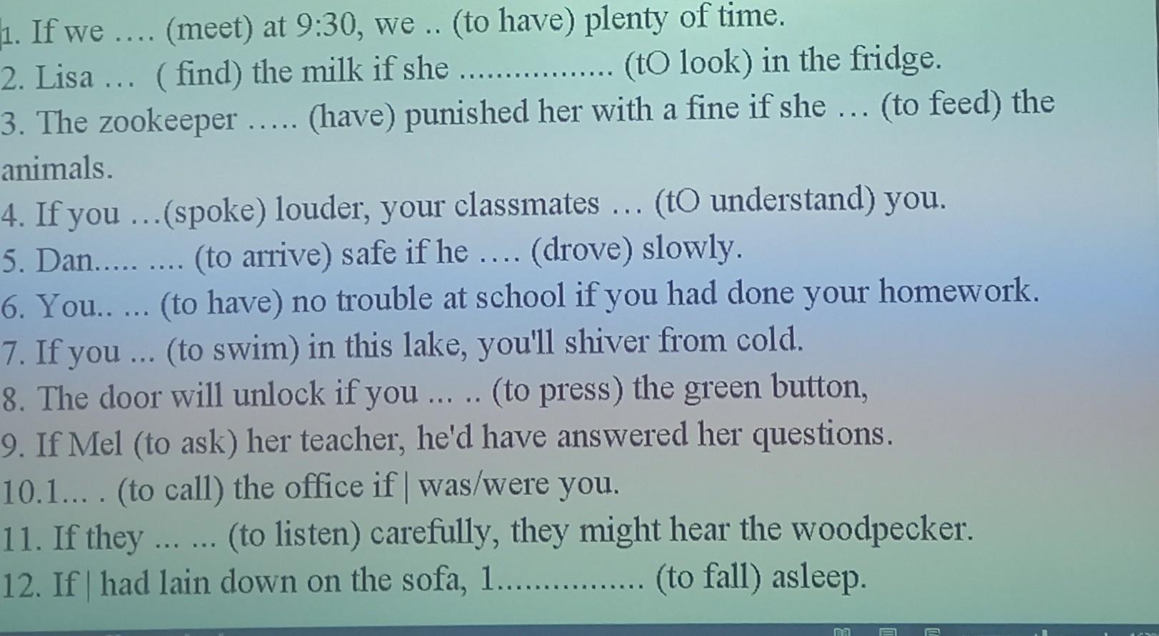 1. If we .... (meet) at 9:30, we .. (to have) plenty of time. (to look) in the fridge. 2. Lisa... (find) the milk if she ........ 3. The zookeeper ..... (have) punished her with a fine if she ... (to feed) the animals. 4. If you ...(spoke) louder, your classmates ... (to understand) you. 5. Dan......... (to arrive) safe if he .... (drove) slowly. 6. You..... (to have) no trouble at school if you had done your homework. 7. If you ... (to swim) in this lake, you'll shiver from cold. 8. The door will unlock if you (to press) the green button, 9. If Mel (to ask) her teacher, he'd have answered her questions. 10.1.... (to call) the office if | was/were you. 11. If they (to listen) carefully, they might hear the woodpecker. 12. If had lain down on the sofa, 1................ (to fall) asleep.