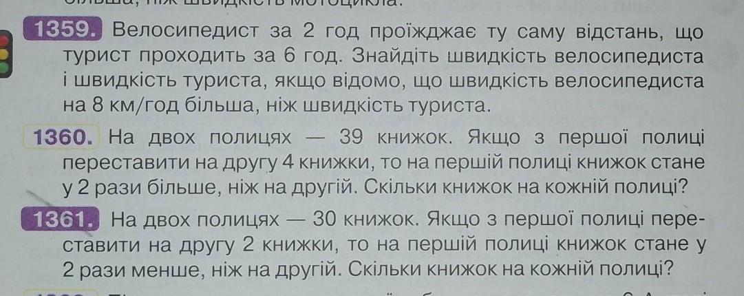 1359. Велосипедист за 2 год проїжджає ту саму відстань, що турист проходить за 6 год. Знайдіть швидкість велосипедиста і швидкість туриста, якщо відомо, що швидкість велосипедиста на 8 км/год бiльша, ніж швидкість туриста.