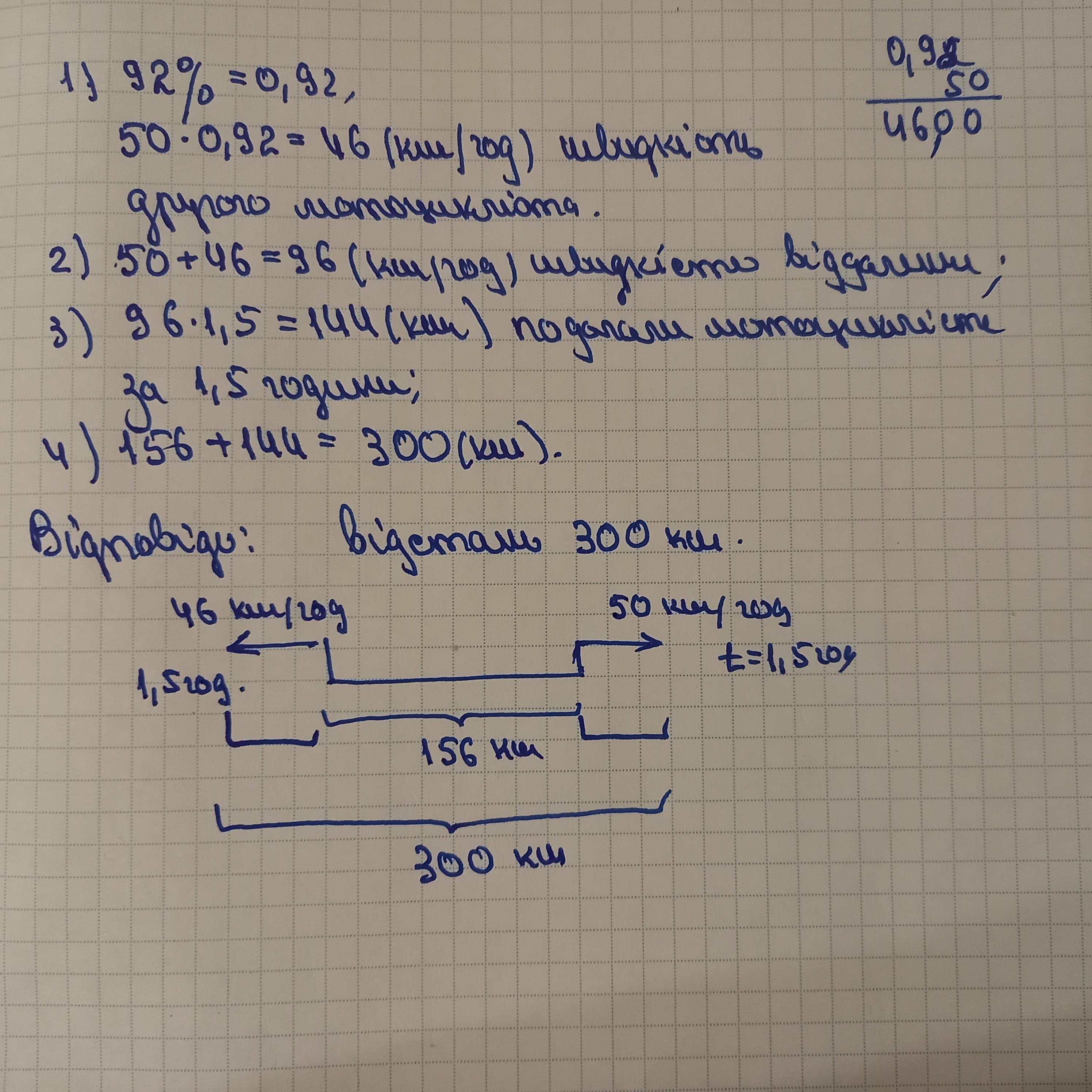 4. З двох пунктів, відстань між якими 156 км, одночасно у протилежних напрямках виїхали два мотоцикліста. Яка відстань між ними через 1,5 год, якщо швидкість одного з них 50 км/год, а швидкість другого становить 92% швидкості першого.
