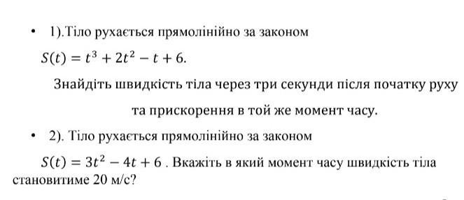 1.Для того, щоб знайти швидкість потрібно взяти похідну від шляху при t=1, а для того, щоб знайти прискорення потрібно знайти похідну від швидкості при t =1.