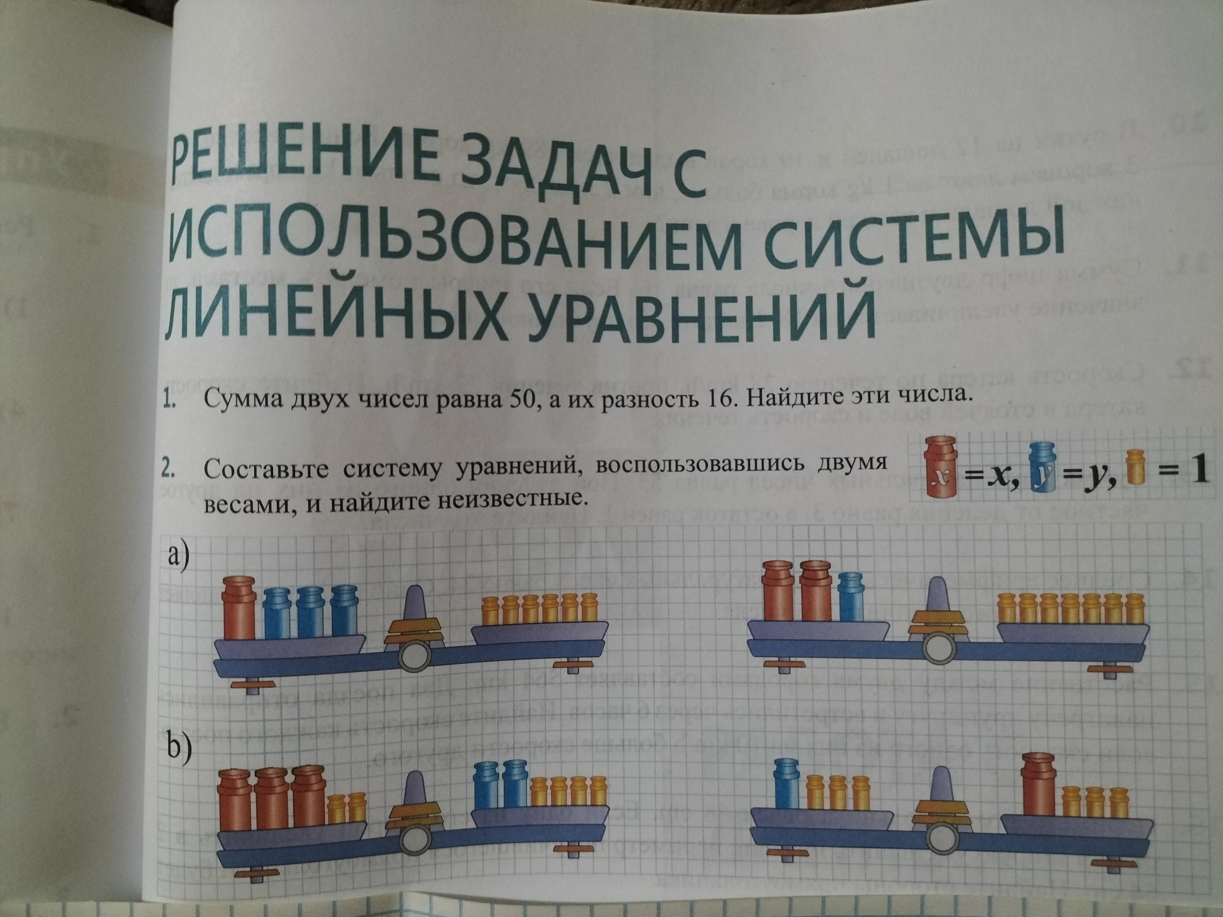 2. Составьте систему уравнений, воспользовавшись двумя весами, и найдите неизвестные.