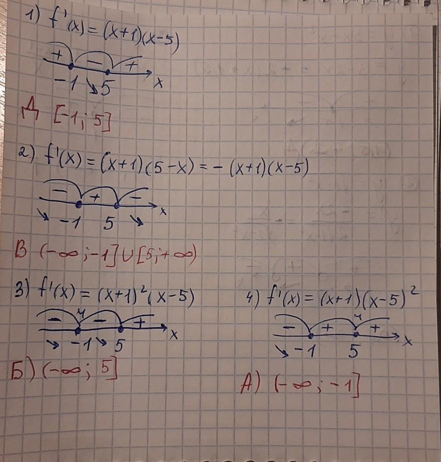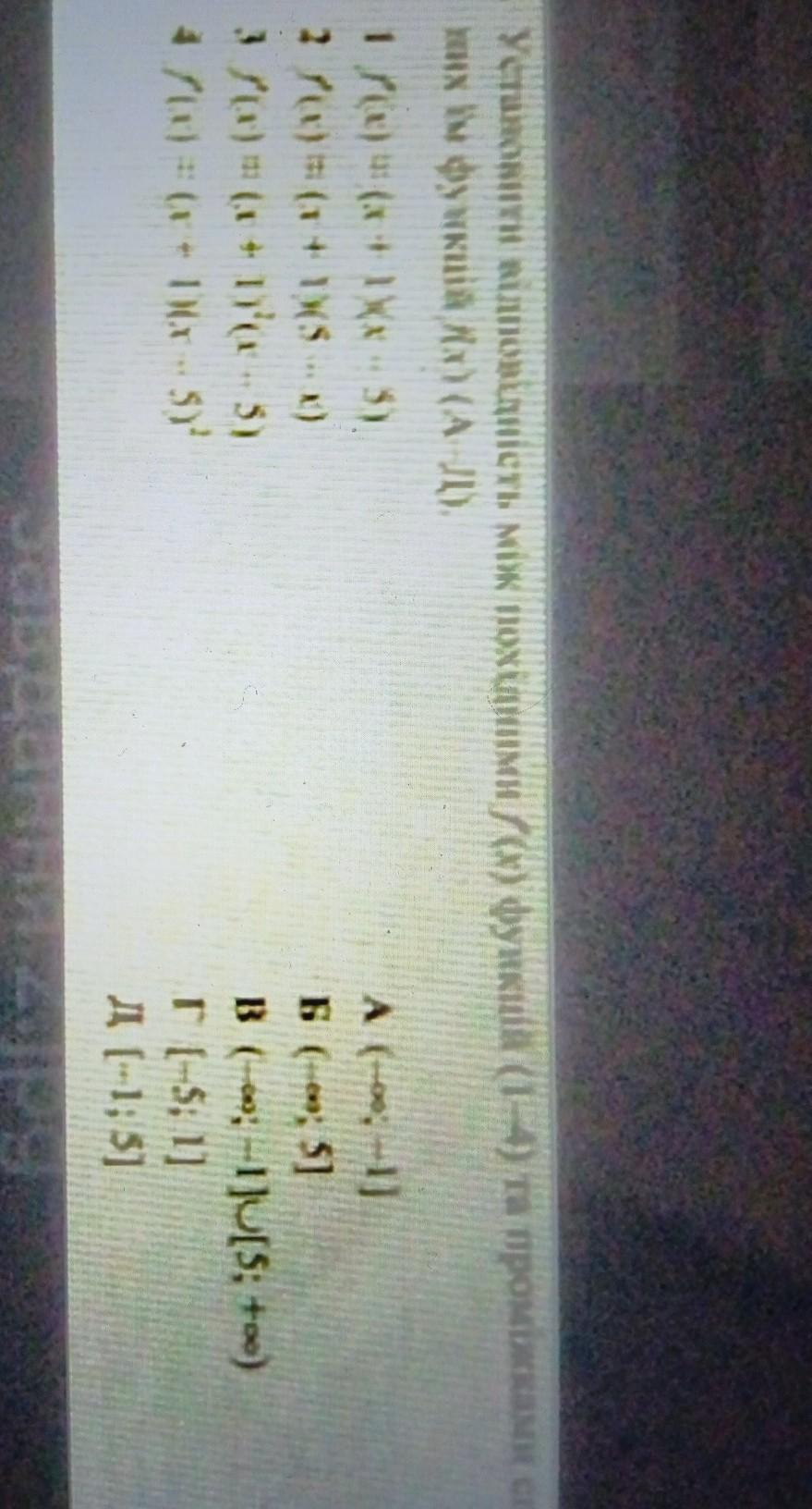 установіть відповідність між похідними f(x)функцій 1-4 та проміжками спадання відносних к ним функцій f(х) (А-Д)