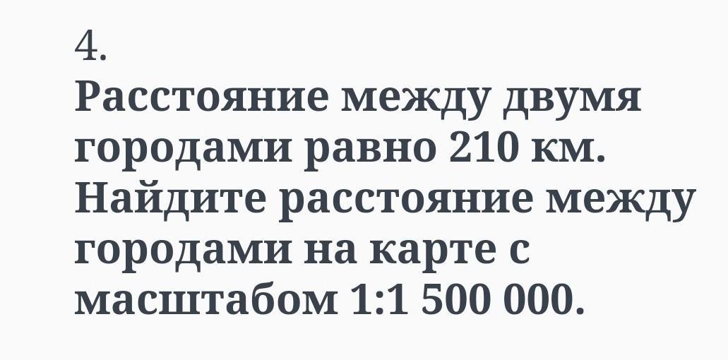 4. Расстояние между двумя городами равно 210 км. Найдите расстояние между городами на карте с масштабом 1:1 500 000.