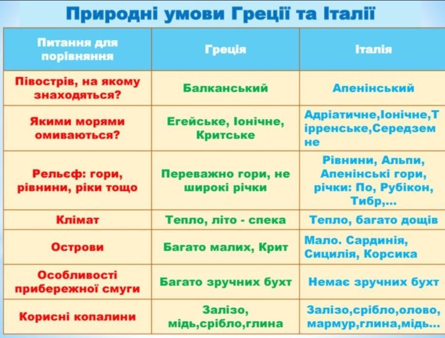 Італія знаходиться на території півострова Апенніни. Тут місцевість місцями горбиста, місцями рівнинна. Італія також, як і Греція омивається з усіх боків морями, крім півночі. Клімат сприяє розвитку землеробства, скотарства і садівництва.