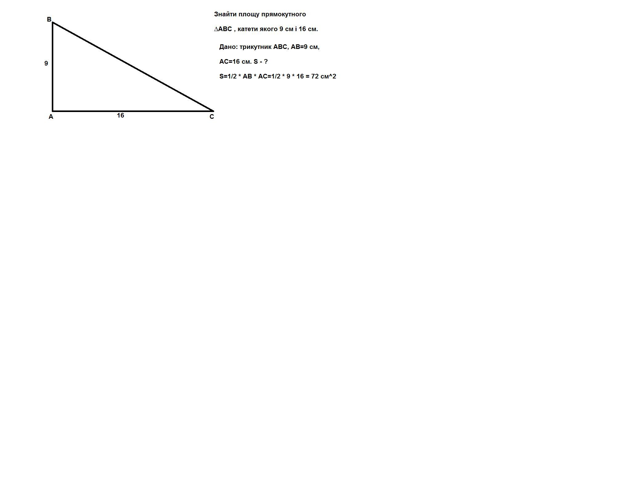 Знайти площу прямокутного ∆АВС , катети якого 9 см і 16 см?